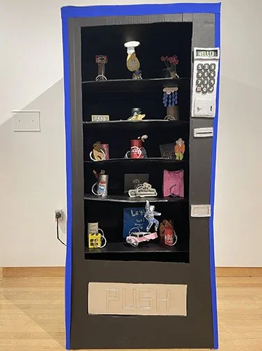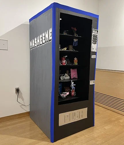Arts@theIntersection is an educational outreach program hosted by the Farnsworth Art Museum with many partnering organizations in midcoast Maine. The program invites middle and high school students and their art teachers from six midcoast schools to collaborate with Farnsworth artist-educators and Maine artists to create artworks for a special, year-long museum exhibition. I joined the project in late January for an expedition to Herring Gut, where I met the Vinalhaven School seventh grade (six students). Over several months, on Vinalhaven and at the Farnsworth’s Gamble Studio, we worked together to develop and construct Masheene, a life-size vending machine filled with paper-made objects drawn from real-life and imagined. Masheene is fun and funny, smart and moody, lovingly crafted and whimsical—it’s a dream of a vending machine for 7th graders who connect with the mainland via the Vinalhaven ferry terminal. It also feels to me like a giant time capsule in the ways it expresses a moment in the students’ lives and their particular intersection with the Farnsworth program.
